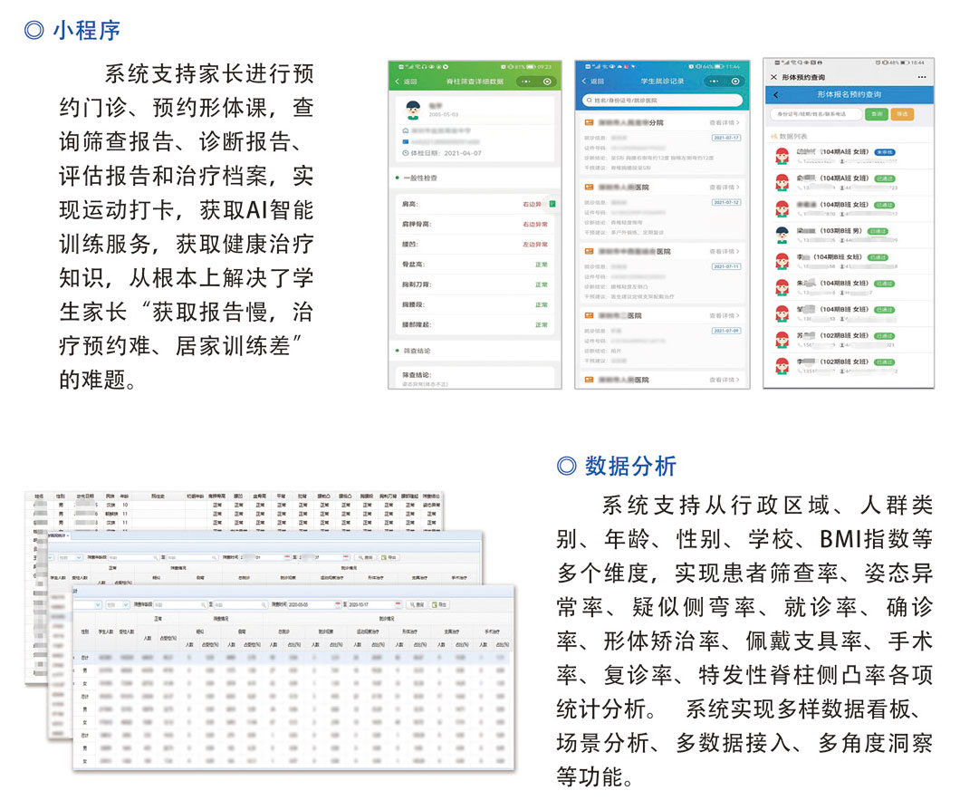 學生脊柱健康管理系統包含行政部門端、醫療機構端、學校端和家長端四大部分,實現了篩查、門診、康復和隨訪的閉環信息管理。系統便攜查記錄、自動判定側彎、出具診療意見、生成運動處方、完成治療檔案,家長可通過微信小程序查詢學生的篩查報告、門診預約、門診報告、形體預約、運動方案、運動打卡和治療效果,通過 A 智能陪練,實現居家智慧運動訓練。系統充分支持“醫療聯盟”、“醫校結合"和“醫體融合”,主管部門掌握轄區學生的姿態異常、脊柱側彎的分布狀況和治療狀況,采取針對性的干預措施。